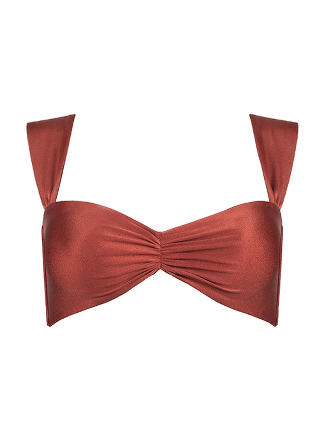 V shaped, cheeky bottom has coconut ring details and thick ruched side straps. Side straps can be worn low or higher on the hip.