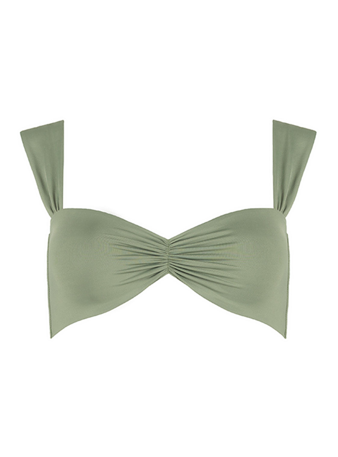 V shaped, cheeky bottom has coconut ring details and thick ruched side straps. Side straps can be worn low or higher on the hip.