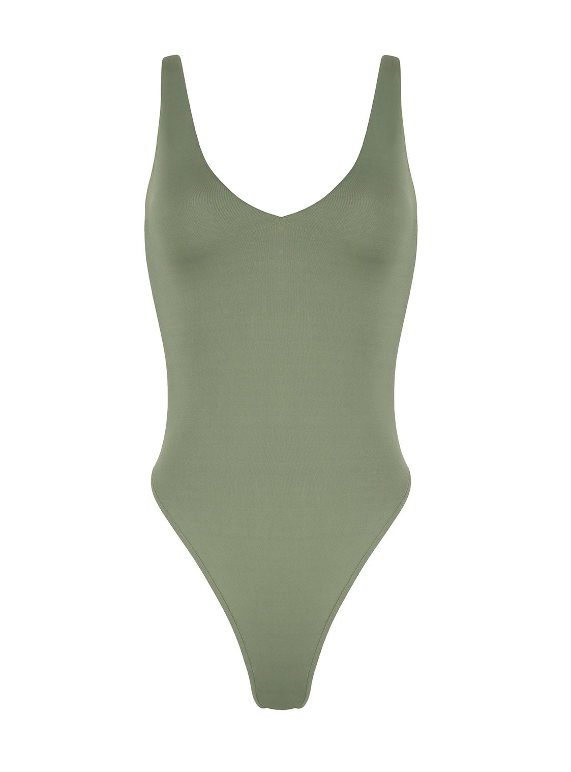 Classic one piece with high cut legs, low open back and low V neck. Provides moderate coverage.